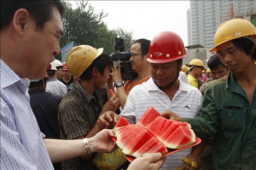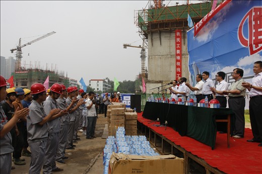 8月5日上午,太原市总工会为农民工送清凉活动在集团公司直属项目一部承建的滨河西路项目工地上隆重举行。10时许,太原市人大副主任、太原市总工会主席刘明珠,太原市副市长张政等领导,率太原市总工会各部门带着西瓜、白糖、绿豆、毛巾、矿泉水等慰问品,来到现场亲切慰战高温、顶酷暑奋战在施工一线的广大农民工兄弟。张政副市长发表讲话,对广大农民工兄弟在太原市城市建设中做出的突出贡献给予了高度赞扬,进一步传达了党和国家重视农民工工作,关心关爱农民工的方针政策。全体农民工以热烈掌声对领导们的慰问表示由衷的感谢。刘明珠主席、张副市长、集团公司董事长王贵聪等领导同志,端着西瓜等慰问品来到农民工兄弟中间,一边送上慰问品,一边亲切交谈,高度体现了太原市人民政府、太原市总工会、我集团公司对农民工工作“以人为本”的理念。活动由集团公司劳务中心和直属项目一部具体承办,太原市总工会副主席李小龙主持了慰问仪式。太原市入并建筑企业工会联合会常务副主席张仲年、集团公司工会主席王斌参加了活动。