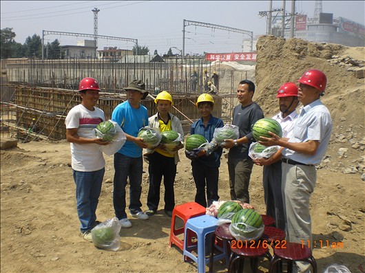 6月23日端午节的上午,前期办领导蒋总指挥与太原一建集团二分公司经理孙庆福及项目班子全体在二分公司承建的南内环东街立交泵站项目部进行慰问,关心端午节仍然坚持工作在施工第一线的广大农民工兄弟,亲手为他们送去粽子、水果、肉类等慰问品,由衷的感谢他们为市重点工程建设做出的贡献。建设单位领导代表住建委对奋斗在市重点工程的一线工人表示节日的慰问,按重点工程要求在雨季前保质保量完成泵站的排水任务。这次慰问不仅仅带去了物质上的礼品,更带去了广大领导对农民工兄弟的那份关心与支持。