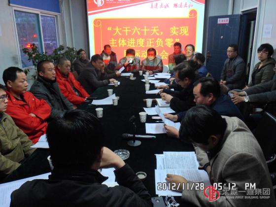 11月28日下午16:30,直属分公司在太原市第三人民医院门诊楼项目部召开了“大干六十天,实现主体进度正负零”的生产动员活动。直属分公司经理郭贵法、副经理赵云江、副经理蔡志峰等领导,施工现场项目负责人毛振武,钢筋外加工配送中心经理郭瑞彪,山西恒台建业发展有限销售公司以总经理张永龙带队一行7人,太原市宏兴海贸易有限公司经理王海卫以及项目部全体管理人员参加了本次会议。本次会议由该项目副经理霍建主持。会议内容有:1、项目经理姬德银做“大干六十天,实现主体进度正负零”为题的生产动员报告,报告以冬季施工为背景,从人、材、机、物等方面提出具体保障措施,加强“四科一室”项目管理对施工生产的快捷服务,来保证实现预期工期目标。2、各科室负责人、材料供应商一一做承诺表态。3、分公司副经理助理赵云江、常务副经理蔡志峰代表分公司对直属302项目部管理团队进行肯定,并表示希望大家不要辜负分公司的信任,不流于形式,强抓落实,保证冬施的顺利进展。4、分公司经理郭贵法高度评价本次会议的召开,详细的分析当前形势,并指出:要抓好活动期间的项目管理及各项措施的落实情况。要求大家要相互信任,指出“人在一起不是团队,心在一起才是团队,要树立统一的价值观”。及时发现问题,努力解决问题,争当先进。同时,希望各供应商积极响应项目部的号召,保证各项物资按期、按量、按标准提供,保证在此施工期间的物质需求。最后,郭经理要求项目部各管理岗位分工协作,心往一处想,有劲一处使,克服严冬,同心协力,狠抓落实,保证“实现主体进度正负零”的进度目标顺利完成,为门诊楼工程按期完工打响“第一枪”,为直属分公司承建太原市人民医院后续工程树立良好企业形象。