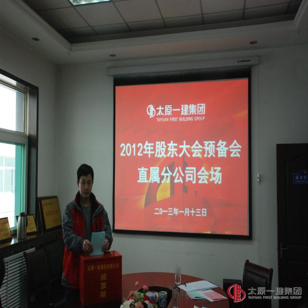 1月13日上午,直属分公司组织全体股东在分公司会议室召开太原一建集团2012年度股东大会预备会。本次会议应到股东9人,出资额人民币437394元;实到股东8人,出资额人民币410346元。会议由分公司经理郭贵法主持。会议的内容:1、分公司经理郭贵法传达了 “1月12日”集团公司会议精神并详细讲解7个报告和通报了通过的《组织机构人员产生办法》、《授权委托实施细则》。2、出席会议的股东经过讨论一致举手表决,通过了各项报告决议的草案。3、对集团公司的董事会、监事会成员进行了投票选举。4、分公司经理郭贵法要求全体股东围绕本次会议的主题,对分公司下一步怎么办提出建设性意见。最后,郭经理号召全体股东作为企业的一份子发挥好主人的作用,同时全体股东对集团公司领导实行民主治企的良策充满信赖和希望!