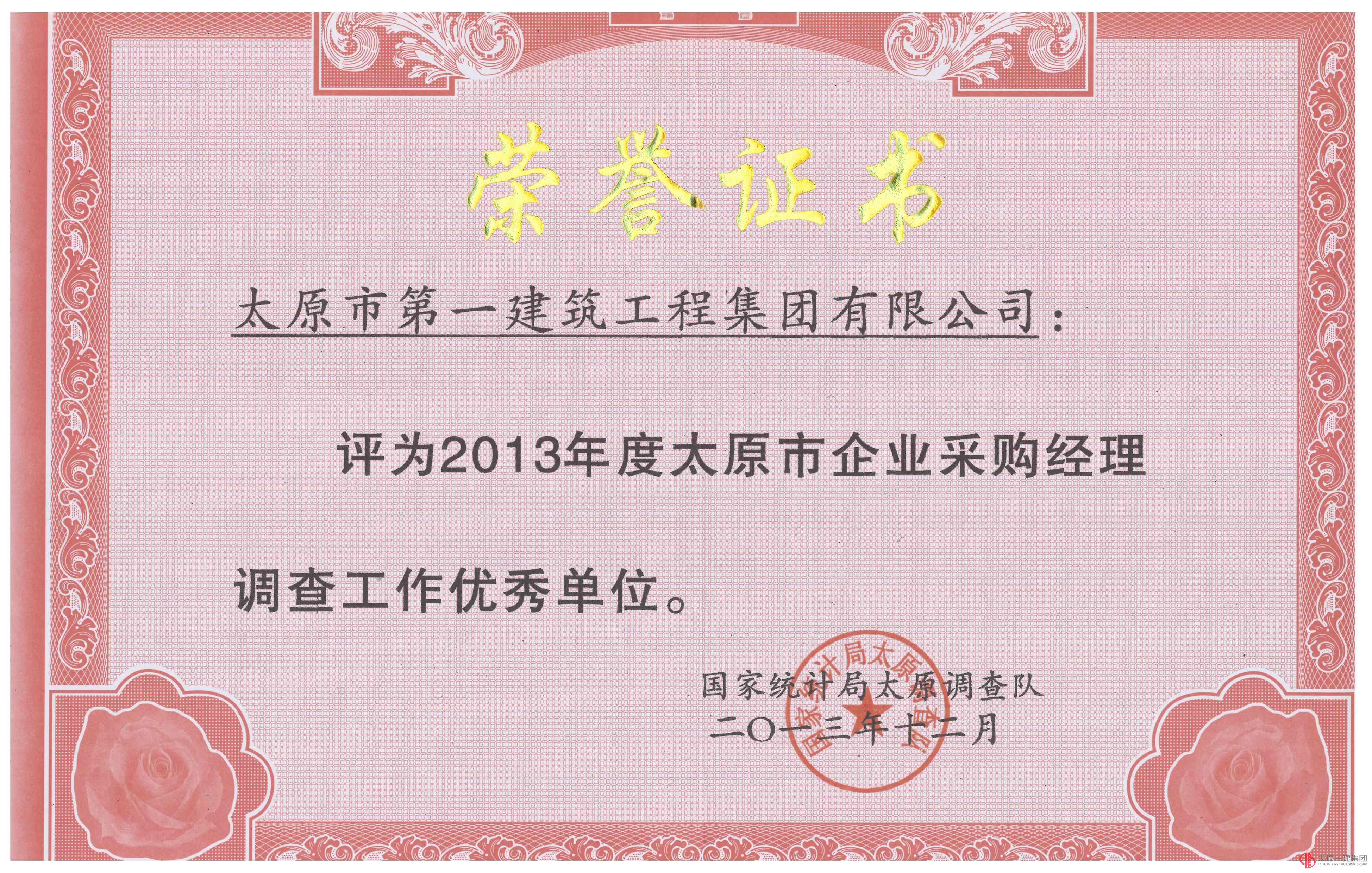集团公司工程管理部在公司领导的大力支持和基层单位统计员的配合下,对全年施工产值等指标进行了精确统计和及时上报,较好的完成了全年统计工作和统计调查工作,取得一定成绩,分别被杏花岭区统计局评为“统计工作先进单位”及国家统计局太原调查队评为“太原市企业采购经理调查工作优秀单位”,同时总经济师王建萍、工程管理部冯志芳被评为“二〇一三年度统计工作先进个人”, 这些荣誉的取得,充分肯定了我集团公司在统计工作方面做出的不屑努力,也是对基层单位统计人员工作的认可,在今后的统计工作中,我们要再接再厉取得更多的成绩。