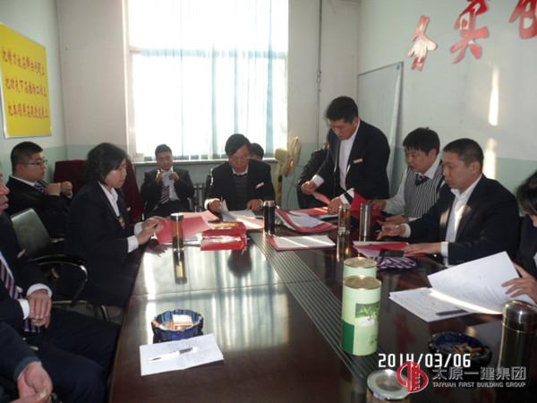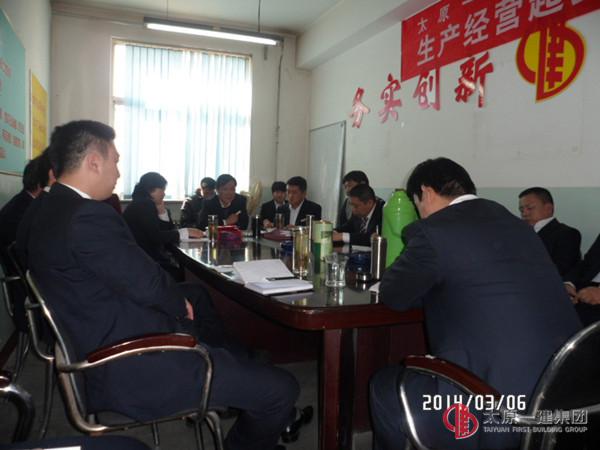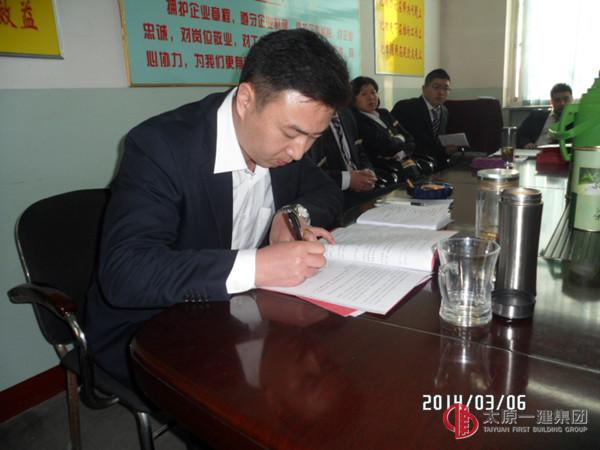 1、由分公司副经理苗强和全体职工学习《并一建经发(2014)4号 2014年企业工作安排》、《并一建经发(2014)1号 2014年企业党建工作安排》文件。2、由分公司经理王东升和全体职工学习了《强化落实、规范管理、努力建设本质安全型企业—-王贵聪2014年2月28日讲话》、《四分公司(2014)01号 2014年生产经营工作目标及措施》文件。3、由分公司主任会计师焦富娟宣读《四分公司(2014)02号 分公司领导成员分工》。4、分公司副经理苗强宣读各项责任书后,分公司经理王东升和各负责人签订了各项责任书。5、由分公司主任会计师焦富娟宣读《并一建经发(2014)10号 关于对2013年成绩突出的单位和个人的表彰决定》及分公司2013年度各项责任书的完成情况。6、由王东升经理颁发各荣誉证书及2013年度各项目标责任书的兑现,并对分公司生产经营作动员讲话及起步工作具体安排。7、集团公司副总经理赵琦对分公司工作提出指导意见。①、对分公司2013年的各项工作表示肯定。②、建立起必胜的信念,相信自我,希望分公司紧紧抓住承揽自建项目这个龙头不放松,今年在承揽自建任务上争取突破。③、在抓好质量和安全工作的同时,加强成本核算意识,以效益为中心,以效益论英雄,为自己为集团公司创造‘双赢’局面。④、加强团队建设,建立起核心管理层,为集团公司的发展体现价值。