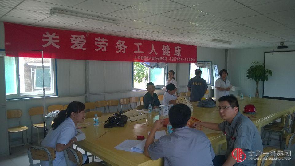 7月24日上午,山西易通建筑劳务有限公司副经理李志带领小店区营盘社区卫生服务中心的相关医务人员,到直属分公司承建的太原市迎泽区郝庄初级中学教学实验楼施工现场为劳务工进行了健康体检。项目部共有75名劳务工参加了体检。体检结束后,项目部依据体检报告进行汇总分析,建立健康档案,及时发现影响身体健康的因素和不良习惯,及早将检查结果反馈给劳务工本人,做到早预防、早诊断、早治疗。本次体检不仅为劳务工送上健康和关爱,更是“以人为本”管理理念的充分体现;体检不仅让劳务工对自己的身体状况有了进一步了解,更使大家真切地感受到企业的人文关怀。