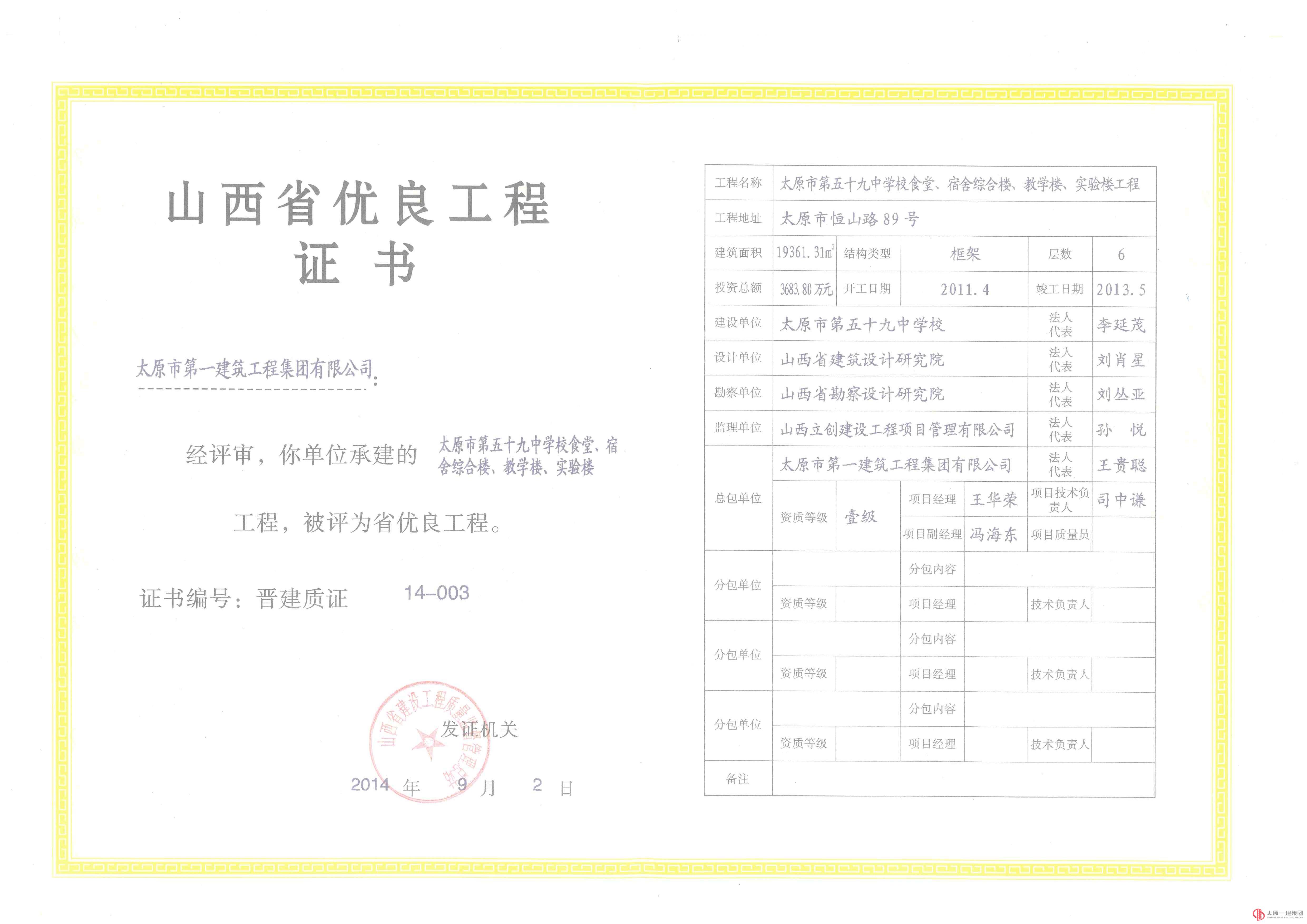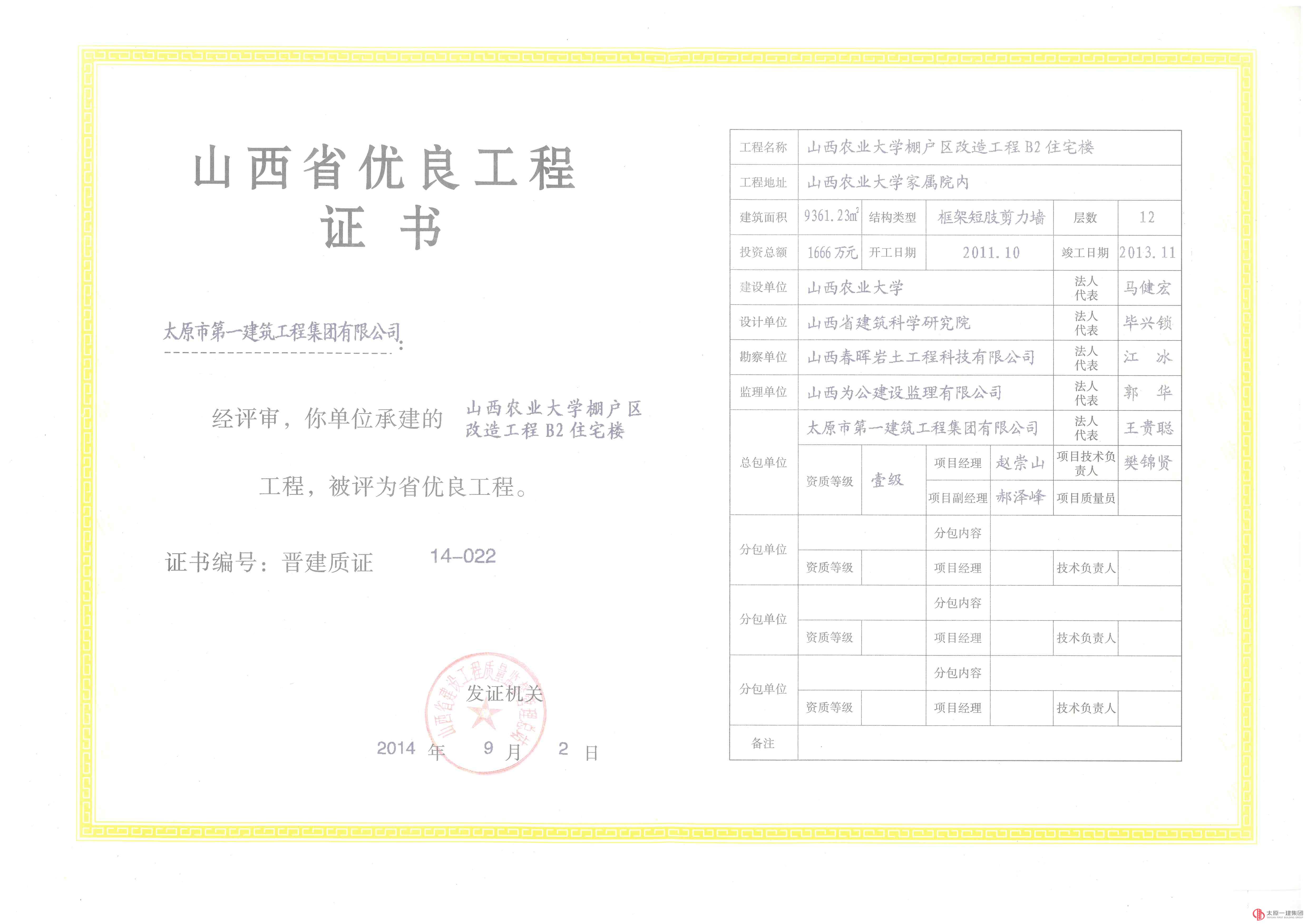 日前,经山西省建设工程质量监督管理总站组织专家现场检查、评定,集团公司承建的四项工程分别被评为2014年山西省优良工程奖,一项工程被评为2014年山西省结构优质工程奖,这些荣誉的取得离不开集团公司的正确领导和工程项目承建基层单位的积极努力。五项获奖工程标志着集团公司施工质量管理水平进一步提高,各基层单位的质量管理意识和创优意识得到进一步增强。在下一步的工作中,工程管理部将结合即将出台的《工程质量细部作法图集》与各基层单位一起为推动集团公司的整体质量管理水平再上台阶做出贡献。集团公司对取得上述荣誉的一分公司、十分公司、十三分公司、直属分公司表示祝贺。