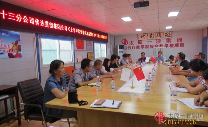 7月26日下午4:30,十三分公司在承建的山西省委党校项目部会议室召开了传达贯彻集团公司《上半年经营情况通报暨下半年工作主措施》会议,会议由分公司经理、党支部书记孟计根主持,集团公司分管领导赵峰及分公司全体员工参加。会议主要内容有: