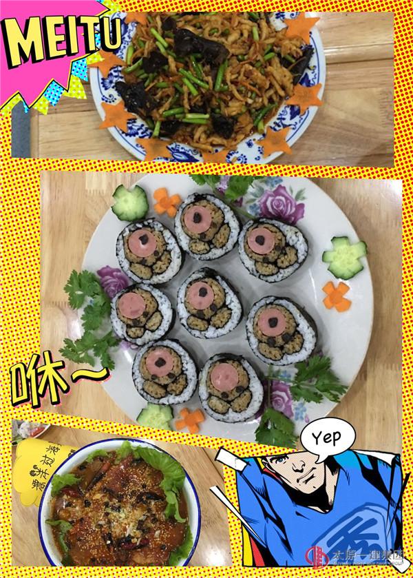 活动当天,幼儿园的食堂里热闹非凡,教师们聚在这里“摩拳擦掌”,洗菜、切菜、炒菜忙得不亦乐乎。冷拼、热炒、清蒸、凉拌陆续上桌,每位老师都使尽浑身解数,纷纷展现自己的绝活。一时间,厨房里飘出了阵阵香味,一道道拿手菜摆满了桌子,色香味俱全的菜品展现出了美女教师们精湛的厨艺。瞧!王晓青老师用鸡丝、红萝卜丝、黄瓜丝、豆腐皮制作了一道“绿肥红瘦金缕衣”,园长李莉萍巧手烹制,将红绿相间的“披萨”送进烤箱,出炉后呈现在大家眼前的是一盘芳香四溢、令人垂涎欲滴的“花好月圆满人间”。郭晓霞老师的小熊“寿司”、金黄“蛋挞”、段晓云和罗娜娜老师的创意水果拼盘以及厨房大师傅曹翠灵的“黄金薯条”、“ 映日荷花”、教学副园长李桂清用香菇和鹌鹑蛋做主料制作的“碧草涟漪月幽幽”、副园长常娟用里脊肉片、木耳、黄豆芽制作的“飘扬过海来看你”、储孝文老师的“陕西油泼面”等菜品获得大家的一致好评。大家在分享品尝美食的同时也不忘互相学习,现场制作的教师身边,站着一溜儿学习观摩的姐妹,大家讨论着、分享着,满满的幸福感像一股股淙淙流淌的清泉萦绕在每一位教师的身边、心田……