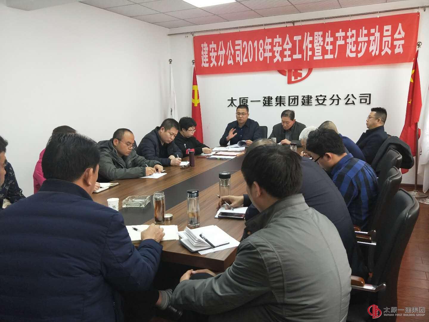 2018年3月6日建安分公司全体员工在会议室召开2018年安全工作暨生产起步动员会,集团公司监事会主席范立强应邀出席会议,会议由分公司经理李伟主持。