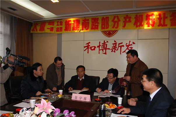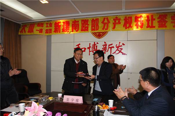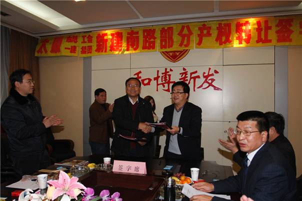 1223下午,太原一建集团与太原市总工会举行了新建南路69号(原115号)部分产权转让签字仪式。太原市人大常委会副主任、市总工会主席刘明珠;副主席李平贵;后勤服务中心主任黄小飞;财务部部长梁家齐;经审办主任安宏;事业中心主任梁巍;纪检组副组长马芳;办公室主任樊小高,太原一建集团公司董事长党委书记总经理王贵聪、副董事长副书记副总经理宋双玉;董事副总经理工会主席王斌;董事总会计师赵晨辉;董事总经理助理财务资产部部长刘洁;董事会总经理办公室主任监事任秀山;行政保卫部部长米凯毅;物业分公司经理书记李文山;一分公司经理书记张玉喜;工会副主席门红等共同出席了签字仪式。甲乙双方法定代表人王贵聪、刘明珠分别在新建南路69号(原115号)转让合同书上签字盖章。最后,双方领导发表了热情洋溢的重要讲话,对签署合同表示祝贺并对甲乙双方今后的共同发展描绘了美好的发展前景。签字仪式结束后,出席签字仪式的双方人员合影留念,集团公司宋双玉主持了签字仪式。