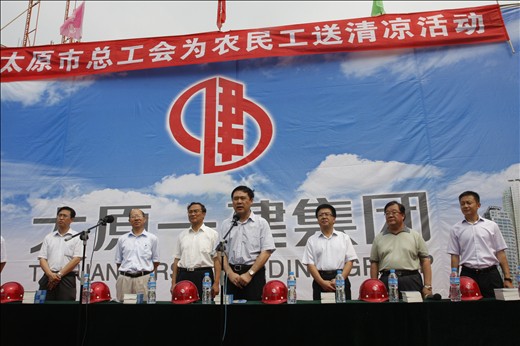 8月5日上午,太原市总工会为农民工送清凉活动在集团公司直属项目一部承建的滨河西路项目工地上隆重举行。10时许,太原市人大副主任、太原市总工会主席刘明珠,太原市副市长张政等领导,率太原市总工会各部门带着西瓜、白糖、绿豆、毛巾、矿泉水等慰问品,来到现场亲切慰战高温、顶酷暑奋战在施工一线的广大农民工兄弟。张政副市长发表讲话,对广大农民工兄弟在太原市城市建设中做出的突出贡献给予了高度赞扬,进一步传达了党和国家重视农民工工作,关心关爱农民工的方针政策。全体农民工以热烈掌声对领导们的慰问表示由衷的感谢。刘明珠主席、张副市长、集团公司董事长王贵聪等领导同志,端着西瓜等慰问品来到农民工兄弟中间,一边送上慰问品,一边亲切交谈,高度体现了太原市人民政府、太原市总工会、我集团公司对农民工工作“以人为本”的理念。活动由集团公司劳务中心和直属项目一部具体承办,太原市总工会副主席李小龙主持了慰问仪式。太原市入并建筑企业工会联合会常务副主席张仲年、集团公司工会主席王斌参加了活动。
