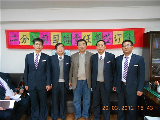 3月20日下午,二分公司召开全体管理人员目标责任书签订会。会议邀请了集团公司董事长、党委书记、总经理王贵聪及副总经理司中谦参加。由副经理崔晓军主持。会议主要议程:一、首先播放二分公司近年来创新发展纪实片,展现了二分公司生产经营取得的优异成绩和积极向上的精神面貌。二、副经理薛军宣读了项目管理目标责任书、安全生产目标责任书、质量管理目标责任书、消防安全目标责任书。经理孙庆福与各项目经理及安全员签订了目标责任书。三、分公司副经理、主任工程师刘海飞宣布2011年受集团公司表彰的项目部名单和分公司嘉奖的决定。王董事长为获得企业优良工程和企业安全文明标准化合格工地的太原新建雷达站项目部颁奖,集团公司奖励8000元,分公司嘉奖35000元。司总经理为获得太原市安全文明标准化工地的太原市慈善学校第二标段颁奖,集团公司奖励5000元,分公司嘉奖5000元。孙经理为荣获市级QC成果的滨河西路电力排管张鉴QC小组颁奖,集团公司奖励1000元,分公司嘉奖1000元。四、经理孙庆福根据集团公司“2.25”会议、“3.11”会议及董事长王贵聪2012年安全讲话的内容,向大家做出了重要指示,明确了分公司2012年的奋斗目标,将安全生产作为首要工作来抓,同时对全年工作做了周密的安排。五、副总经理司中谦对二分公司的纪实片提出了宝贵的意见。提出两项要求:1、力争完成2012年利润指标;2、重点做好南内环东延地产开发工作。贯彻落实王董事长提出的六个“树立”:1、树立积极向上的风气;2、树立对工作认真的作风;3、树立学习创新的风气;4、树立团结协作的风气;5、树立友善助人的风气;6、树立专心干事的风气。最后,董事长王贵聪肯定了二分公司2011年取得的成绩,作为集团公司的模范单位,要起带头,走在前,做表率,用实际行动践行这一荣誉。在今后工作中,确保生产安全,财务工作安全。全面快速提升二分公司的社会形象,加强施工现场和自身管理。并提出二分公司经营发展方向:1、巩固承揽市政工程的市场;2、下大力气开拓保障性住房的市场。