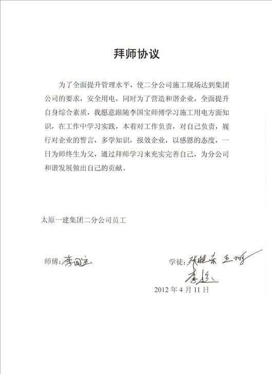 2012年4月11日上午,二分公司在太原滨河西路南延冶峪雨水泵站项目部举行了张晓东、李峻、王鹏三位同志拜李国宝为师傅,学习做人做事及现场管理各方面知识的拜师仪式,三位徒弟现场行拜师礼,向师傅递交了拜师协议。此项活动是为了达到集团公司提出的全面发展,提高现场管理水平的要求,紧密结合分公司实际,培养青年人学技术、做好人、尊师学艺的风气,营造和谐发展,尽快成才,为企业尽快培养青年人学好技术而举行的。仪式由副经理刘海飞主持,分公司经理孙庆福讲话,项目部全体管理人员参加。