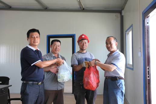 端五节”前夕(622),项管处副处长李朝峰、支部副书记、工会主席李宝林代表项管处,前去山阴县玉井煤矿棚户区改造工程工地,送去粽子、同时受集团公司工会的委托送去防暑降温食品茶叶、绿豆、冰糖等,慰问坚守岗位的全体职工(包括农民工兄弟),从而激发他们的工作热情,鼓舞了士气。