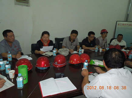 8月18日上午,一分公司在汉唐项目部召开生产周例会,参加人分公司领导班子全体成员、各部门负责人和合作队伍负责人,副经理赵正主持会议。内容:一是对施工现场进行了安全检查;二是施工技术科科长任晓云,对本周检查该项目部存在的安全隐患情况进行了通报;三是项目经理宋志军对存在的问题整改情况作了汇报;四是项目经理芦涛对田和项目部目前的工作进度进行了汇报;五是经理张玉喜从五个方面做了重要讲话:1、对各部门负责人上周工作落实情况进行核实;2、对本周工作计划进行询问;3、讲了目前形势及最近发生的安全事故案例进行分析,针对汉唐项目部安全设施的投入以及现场的标识、存在的隐患部位、责其在一周之内必须整改到位,坚决杜绝事故发生;4、对田和项目部进度问题进行指导;5、对农建队的结算和汛期工作进行了进一步强调和安排。