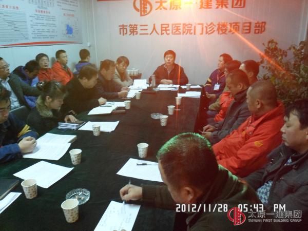 11月28日下午16:30,直属分公司在太原市第三人民医院门诊楼项目部召开了“大干六十天,实现主体进度正负零”的生产动员活动。直属分公司经理郭贵法、副经理赵云江、副经理蔡志峰等领导,施工现场项目负责人毛振武,钢筋外加工配送中心经理郭瑞彪,山西恒台建业发展有限销售公司以总经理张永龙带队一行7人,太原市宏兴海贸易有限公司经理王海卫以及项目部全体管理人员参加了本次会议。本次会议由该项目副经理霍建主持。会议内容有:1、项目经理姬德银做“大干六十天,实现主体进度正负零”为题的生产动员报告,报告以冬季施工为背景,从人、材、机、物等方面提出具体保障措施,加强“四科一室”项目管理对施工生产的快捷服务,来保证实现预期工期目标。2、各科室负责人、材料供应商一一做承诺表态。3、分公司副经理助理赵云江、常务副经理蔡志峰代表分公司对直属302项目部管理团队进行肯定,并表示希望大家不要辜负分公司的信任,不流于形式,强抓落实,保证冬施的顺利进展。4、分公司经理郭贵法高度评价本次会议的召开,详细的分析当前形势,并指出:要抓好活动期间的项目管理及各项措施的落实情况。要求大家要相互信任,指出“人在一起不是团队,心在一起才是团队,要树立统一的价值观”。及时发现问题,努力解决问题,争当先进。同时,希望各供应商积极响应项目部的号召,保证各项物资按期、按量、按标准提供,保证在此施工期间的物质需求。最后,郭经理要求项目部各管理岗位分工协作,心往一处想,有劲一处使,克服严冬,同心协力,狠抓落实,保证“实现主体进度正负零”的进度目标顺利完成,为门诊楼工程按期完工打响“第一枪”,为直属分公司承建太原市人民医院后续工程树立良好企业形象。
