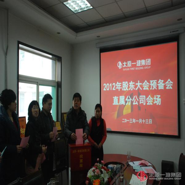 1月13日上午,直属分公司组织全体股东在分公司会议室召开太原一建集团2012年度股东大会预备会。本次会议应到股东9人,出资额人民币437394元;实到股东8人,出资额人民币410346元。会议由分公司经理郭贵法主持。会议的内容:1、分公司经理郭贵法传达了 “1月12日”集团公司会议精神并详细讲解7个报告和通报了通过的《组织机构人员产生办法》、《授权委托实施细则》。2、出席会议的股东经过讨论一致举手表决,通过了各项报告决议的草案。3、对集团公司的董事会、监事会成员进行了投票选举。4、分公司经理郭贵法要求全体股东围绕本次会议的主题,对分公司下一步怎么办提出建设性意见。最后,郭经理号召全体股东作为企业的一份子发挥好主人的作用,同时全体股东对集团公司领导实行民主治企的良策充满信赖和希望!