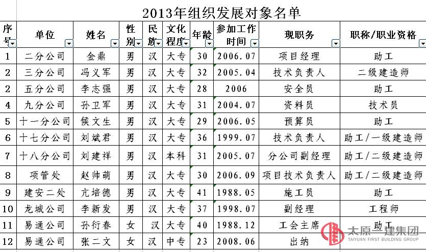 经基层支部研究,党委组织部门考察,拟定以下12名同志为2013年组织发展对象,现公示如下:请广大党员和职工群众监督,对以下发展对象如有疑义,请向党群工作部反映。