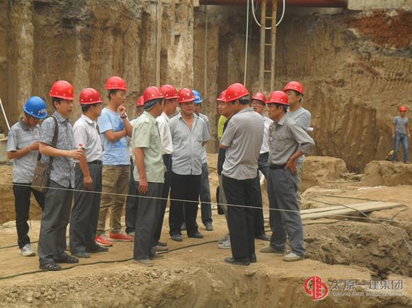 由四分公司承建的山西医科大学第二医院综合住院楼项目正在进行土方开挖施工,目前正值雨季,为避免已开挖基槽被雨水浸泡,于2013年6月18日上午在太原市质量监督管理站贾永华监督员的监督下,由监理单位组织建设单位、设计单位、勘察单位、施工单位相关人员进行1—5轴,A—J轴桩基验收及验槽,经过对内业资料、施工现场的检查验收,贾工对所验收部位的资料及实体质量给予充分的肯定,并要求继续保持,真正体现太原一建集团的实力,最后同意1—5轴,A—J轴桩基验收及验槽,可以进行下一道工序施工。