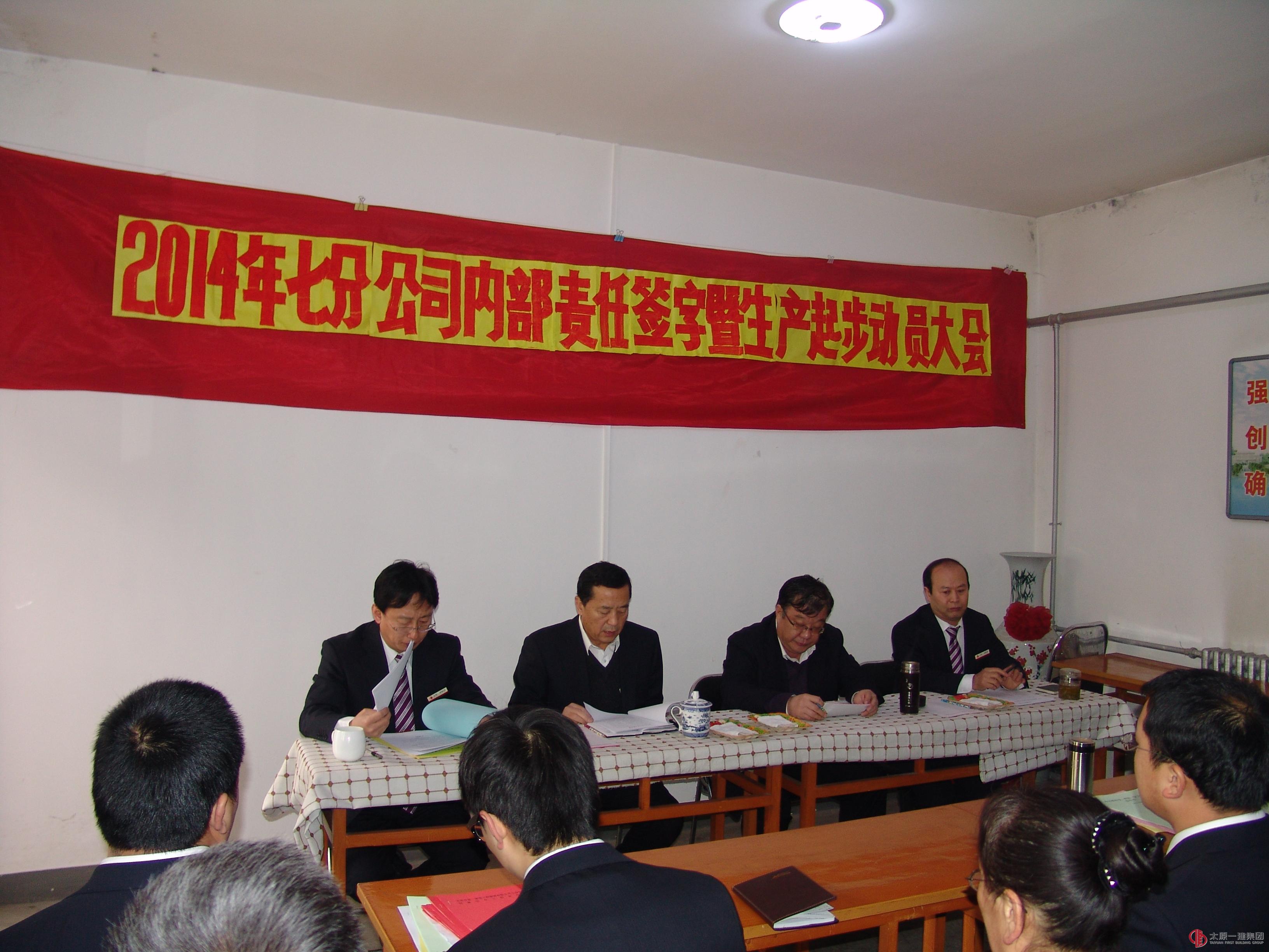在集团公司召开“2014年企业工作暨生产起步动员大会”后,七分公司为贯彻落实会议精神,快速开展2014年生产工作,于2014年3月1日召开“2014年七分公司内部责任签字暨生产起步动员大会”。会上分公司经理郭建新作了2013年工作总结,2014年工作安排。宣读了集团公司下发表彰分公司获奖文件,并根据分公司奖罚文件,对在2013年中取得荣誉的集体和个人另外予以嘉奖。希望全体职工能够奋发向上,积极进取,向个人先进看齐,与团队达成共识,努力拼搏,向2014年的工作目标跨越迈进。