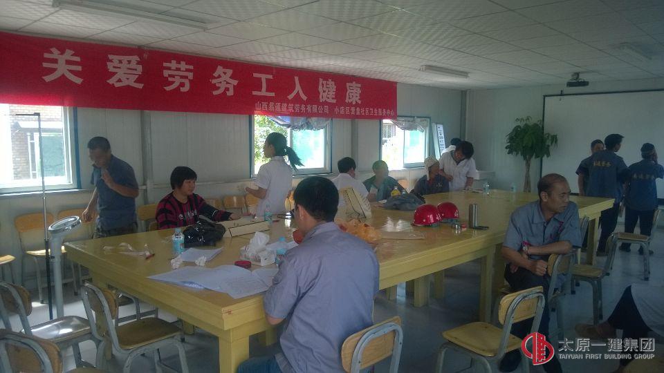 7月24日上午,山西易通建筑劳务有限公司副经理李志带领小店区营盘社区卫生服务中心的相关医务人员,到直属分公司承建的太原市迎泽区郝庄初级中学教学实验楼施工现场为劳务工进行了健康体检。项目部共有75名劳务工参加了体检。体检结束后,项目部依据体检报告进行汇总分析,建立健康档案,及时发现影响身体健康的因素和不良习惯,及早将检查结果反馈给劳务工本人,做到早预防、早诊断、早治疗。本次体检不仅为劳务工送上健康和关爱,更是“以人为本”管理理念的充分体现;体检不仅让劳务工对自己的身体状况有了进一步了解,更使大家真切地感受到企业的人文关怀。