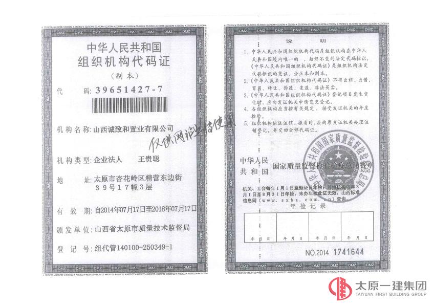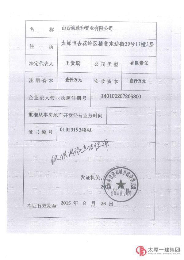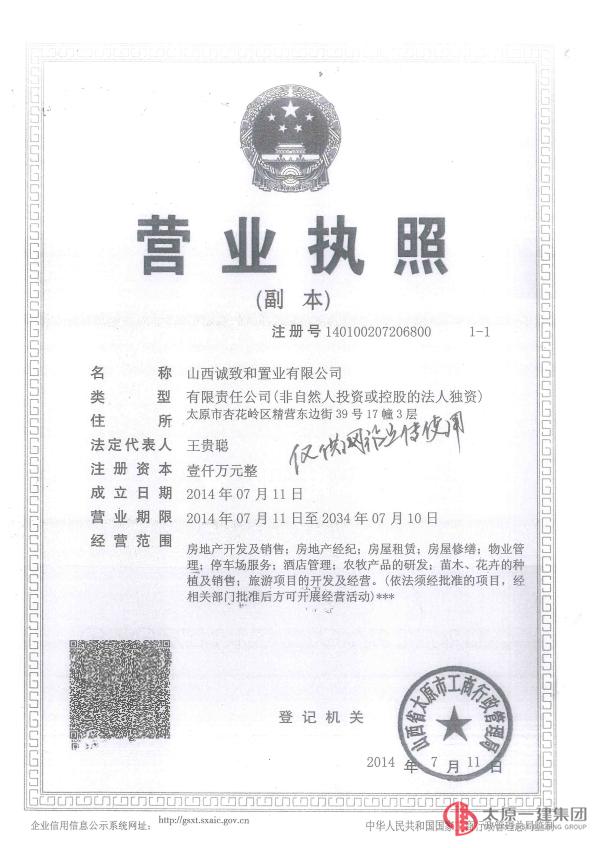 集团公司投资的子公司山西诚致和置业有限公司已于2014年8月26日正式成立。公司营业执照、资质证、税务登记证、组织机构代码证都已申领完毕,营业范围包括房地产开发及销售;房地产经纪;房屋租赁;房屋修缮;物业管理;停车场服务;酒店管理;农牧产品的研发;苗木、花卉的种植及销售;旅游项目的开发及经营。各基层单位若有经营业务可与集团公司联系。