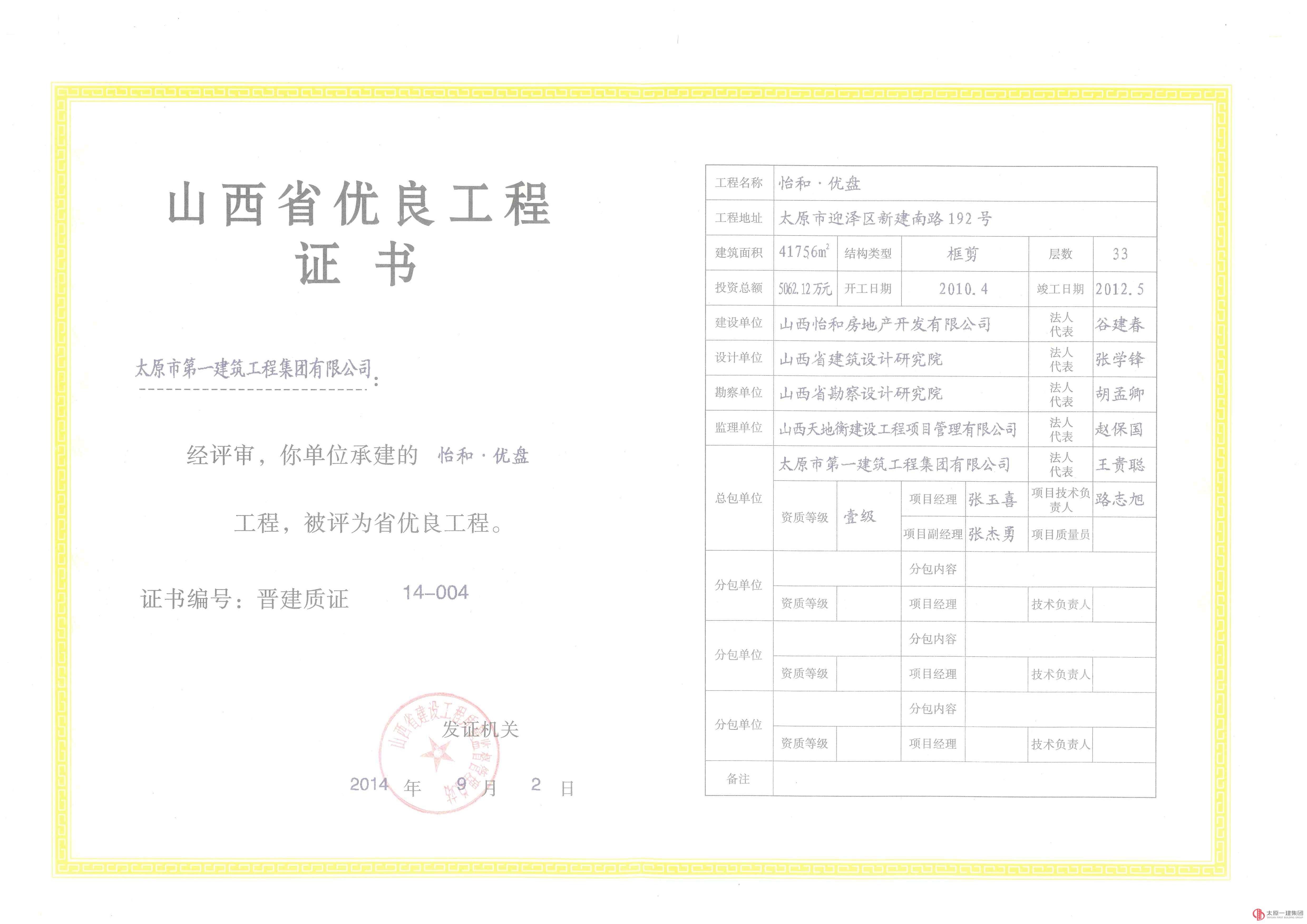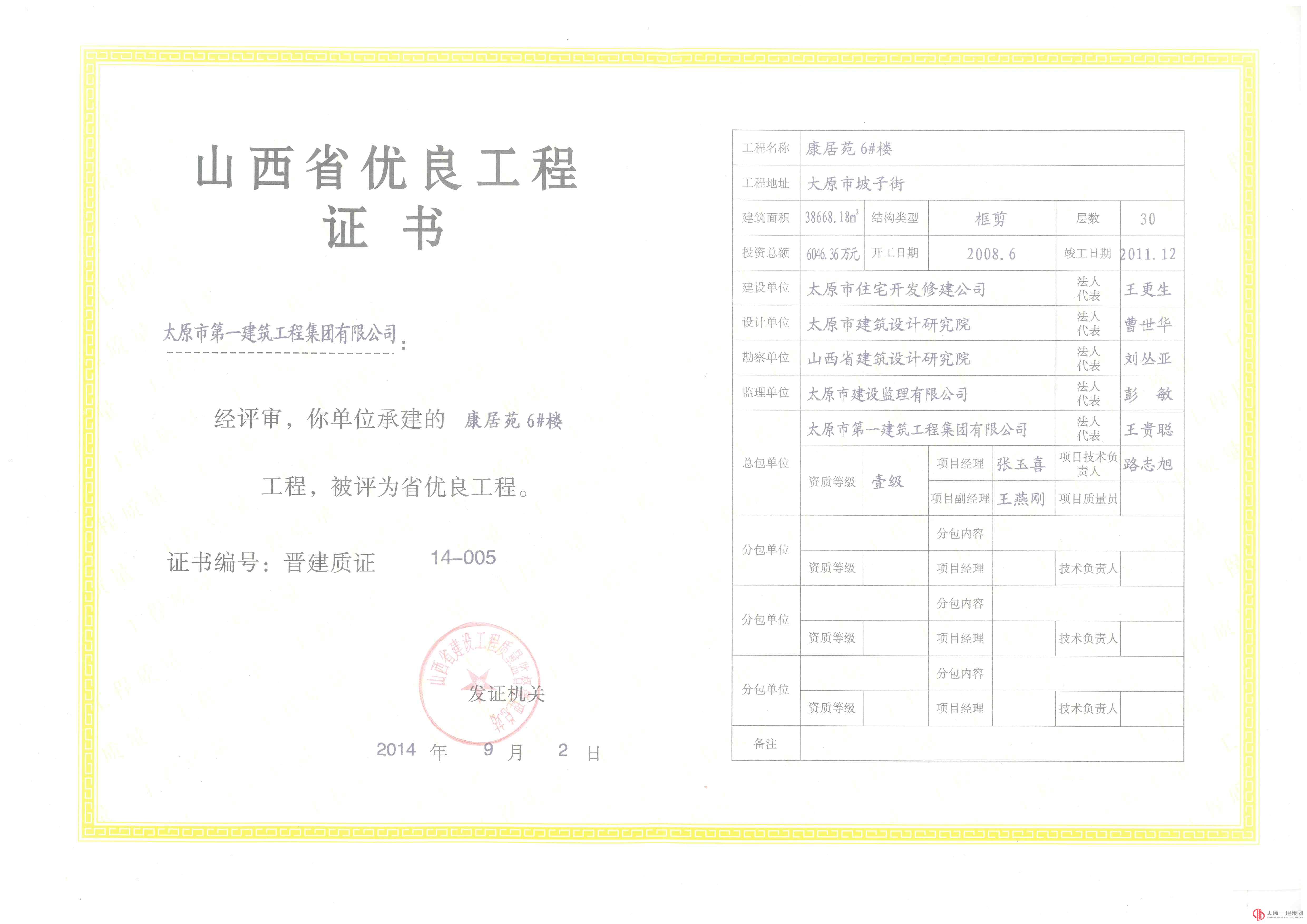 日前,经山西省建设工程质量监督管理总站组织专家现场检查、评定,集团公司承建的四项工程分别被评为2014年山西省优良工程奖,一项工程被评为2014年山西省结构优质工程奖,这些荣誉的取得离不开集团公司的正确领导和工程项目承建基层单位的积极努力。五项获奖工程标志着集团公司施工质量管理水平进一步提高,各基层单位的质量管理意识和创优意识得到进一步增强。在下一步的工作中,工程管理部将结合即将出台的《工程质量细部作法图集》与各基层单位一起为推动集团公司的整体质量管理水平再上台阶做出贡献。集团公司对取得上述荣誉的一分公司、十分公司、十三分公司、直属分公司表示祝贺。
