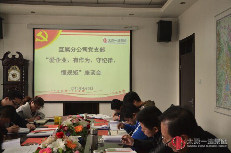 4月6日上午,直属分公司党支部在分公司会议室以座谈会的形式开展“爱企业、有作为、守纪律、懂规矩”主题教育活动。会议由党支部副书记高卫国主持,分公司班子成员、全体党员、团员参加了会议。会议的主要内容是:一、党支部书记郭贵法介绍开展“爱企业、有作为、守纪律、懂规矩”主题教育活动的背景,明确召开本次会议的意义。二、党支部副书记高卫国再次强调集团公司3月28日会议精神。三、共同深入学习《2015年企业党建工作安排》、《2015年工会工作安排》、《2015年团委工作安排》文件和习近平总书记关于守纪律、讲规矩系列讲话精神及集团公司党委书记王贵聪在机关干部见面会上的讲话精神。四、在共同唱《司歌》、观看纪录片《铁人王进喜》后,分公司全体参会人员以“爱企业、有作为、守纪律、懂规矩”为主题,结合自身本职工作,企业实际,企业“家”文化,从爱企敬业自己如何做,遵章守规自己做得如何,本单位、本部门有哪些不守纪律的现象等方面展开讨论,通过查找自身工作中的不足,结合工作实际提出了整改措施。五、党支部书记郭贵法针对本次主题教育活动提出三点要求:1、要正确对待,深刻理解本次会议召开的目的和意义。2、要适应形势,身先士卒,做好表率,全面提高自身素质。3、要立足本职岗位,钻研技术,脚踏实地,体现自我,与企业共同发展。本次会议在全体参会人员进行了庄严的《员工誓词》宣誓后圆满结束。