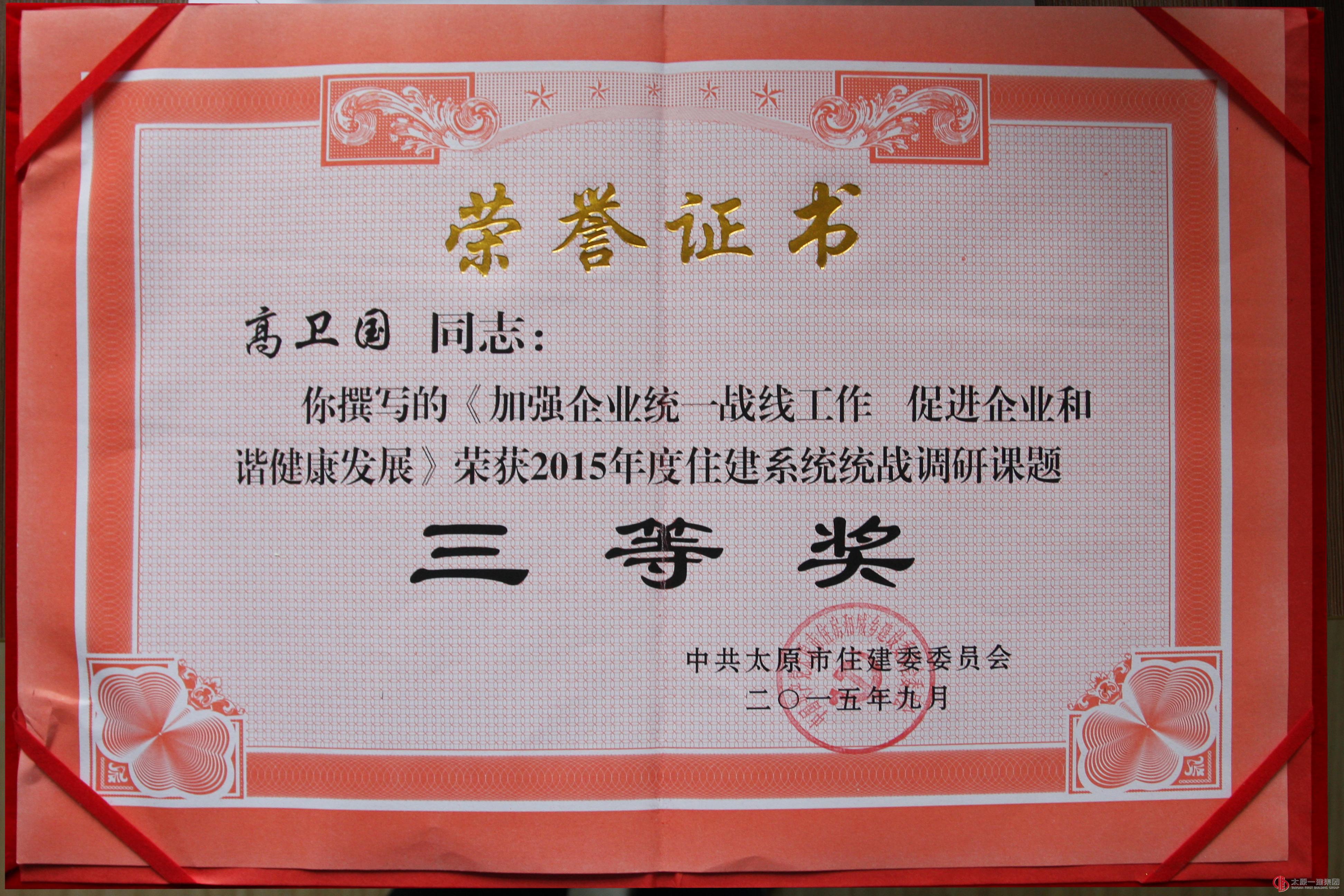 中秋前夕,太原市住建委党委对全系统统战调研课题活动中的先进单位和个人进行了表彰。集团公司党委在本次活动中精心组织,认真落实,获得 “优秀组织奖”称号;直属分公司党支部副书记高卫国以《加强统一战线工作,促进企业和谐健康发展》为主题的论文荣获统战调研课题三等奖。这是集团公司近两年来连续在此项活动中获得集体和个人奖项。为集团公司增添了新的荣誉。