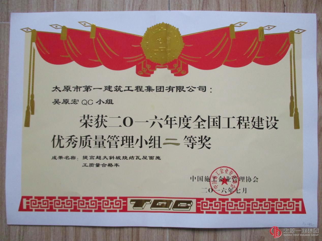 中国施工企业管理协会2016年度优秀QC成果活动发布会在福建省厦门市隆重召开。会议的主题是“万众创新•扎实推进•分享提升”。来自全国各地700余家施工企业共928个成果(涵盖管理型、创新性、现场型、公关型和服务型)全部进行发布。我集团公司吕梁分公司汾阳监狱项目部QC小组课题《提高超大斜坡烧结瓦屋面施工质量合格率》荣获二等奖。另外通过协会评审我集团公司荣获2016年度全国工程建设质量管理优秀企业、总经理李世雄被评选为全国工程建设质量管理卓越领导者、汾阳监狱项目经理吴原宏被评为全国工程建设质量管理小组活动优秀推进者。在此表示祝贺。