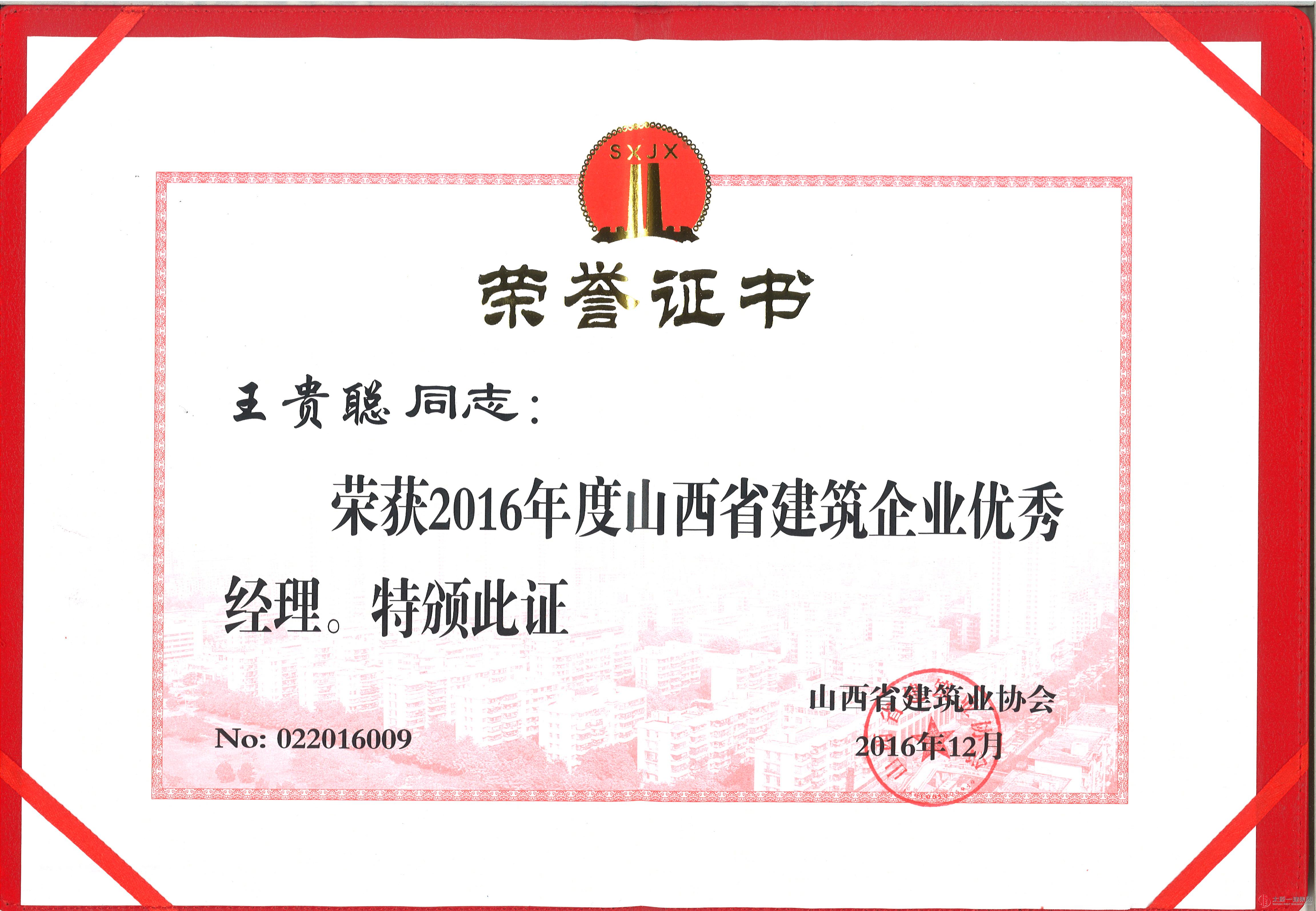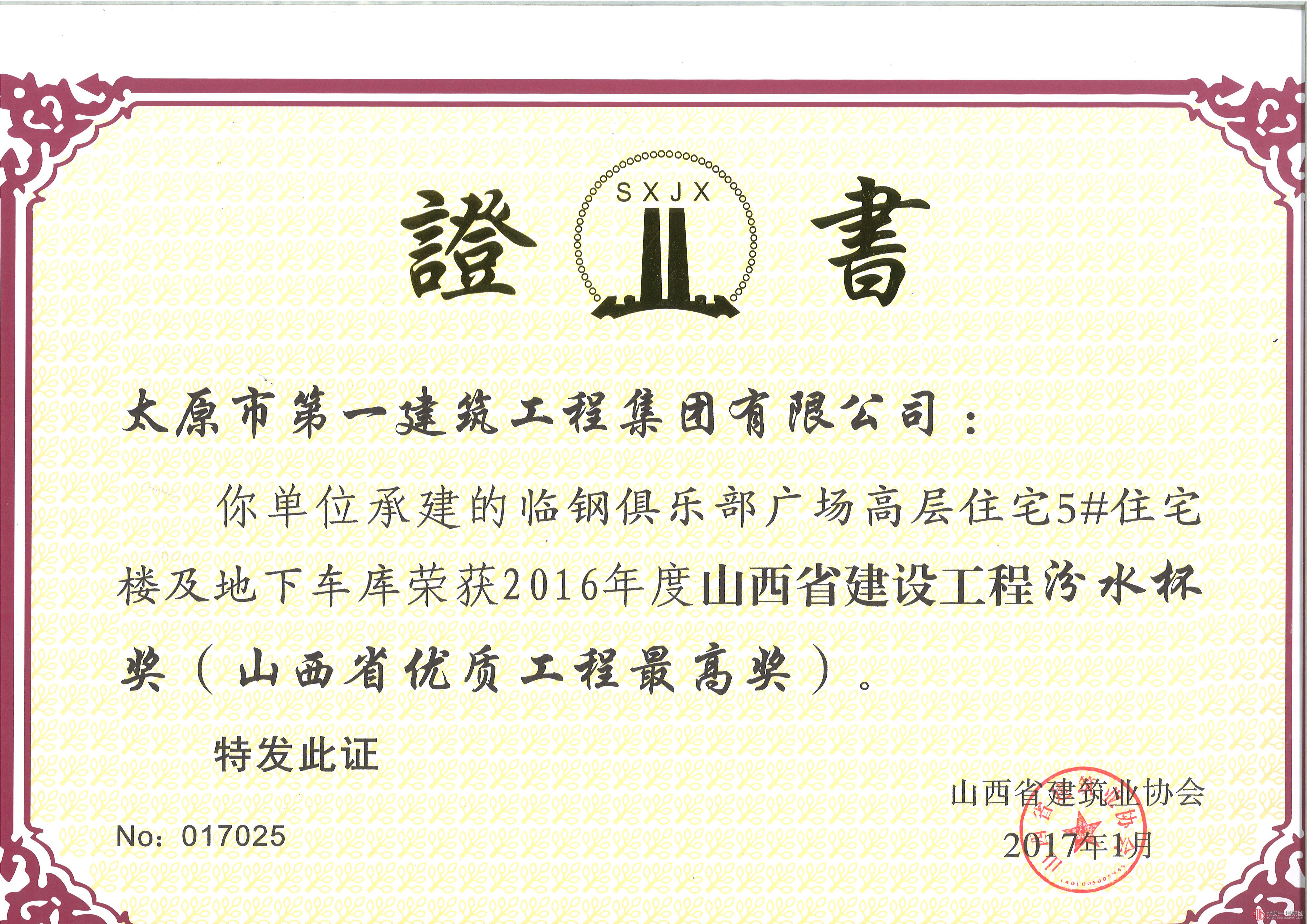 2017年4月1日,山西省建筑业协会在并举办三届七次理事会暨表彰大会。会上,公布并表彰了2016年度山西省建筑业优秀建筑企业、优秀经理、优秀项目经理及2016年度山西建设工程汾水杯奖项的决定。集团公司荣获2016年度山西省建筑业优秀建筑企业;王贵聪荣获2016年度山西省建筑业优秀经理;张浩、李建虎、张晋峰荣获2016年度山西省建筑业优秀项目经理;湫水河临县城区段综合治理(二期)工程二标段及上游景观绿化工程一标段;霍煤李雅庄矿生活区高层住宅3#楼;临钢俱乐部广场高层住宅5#住宅楼及地下车库三项工程荣获2016年度山西建设工程汾水杯奖项。