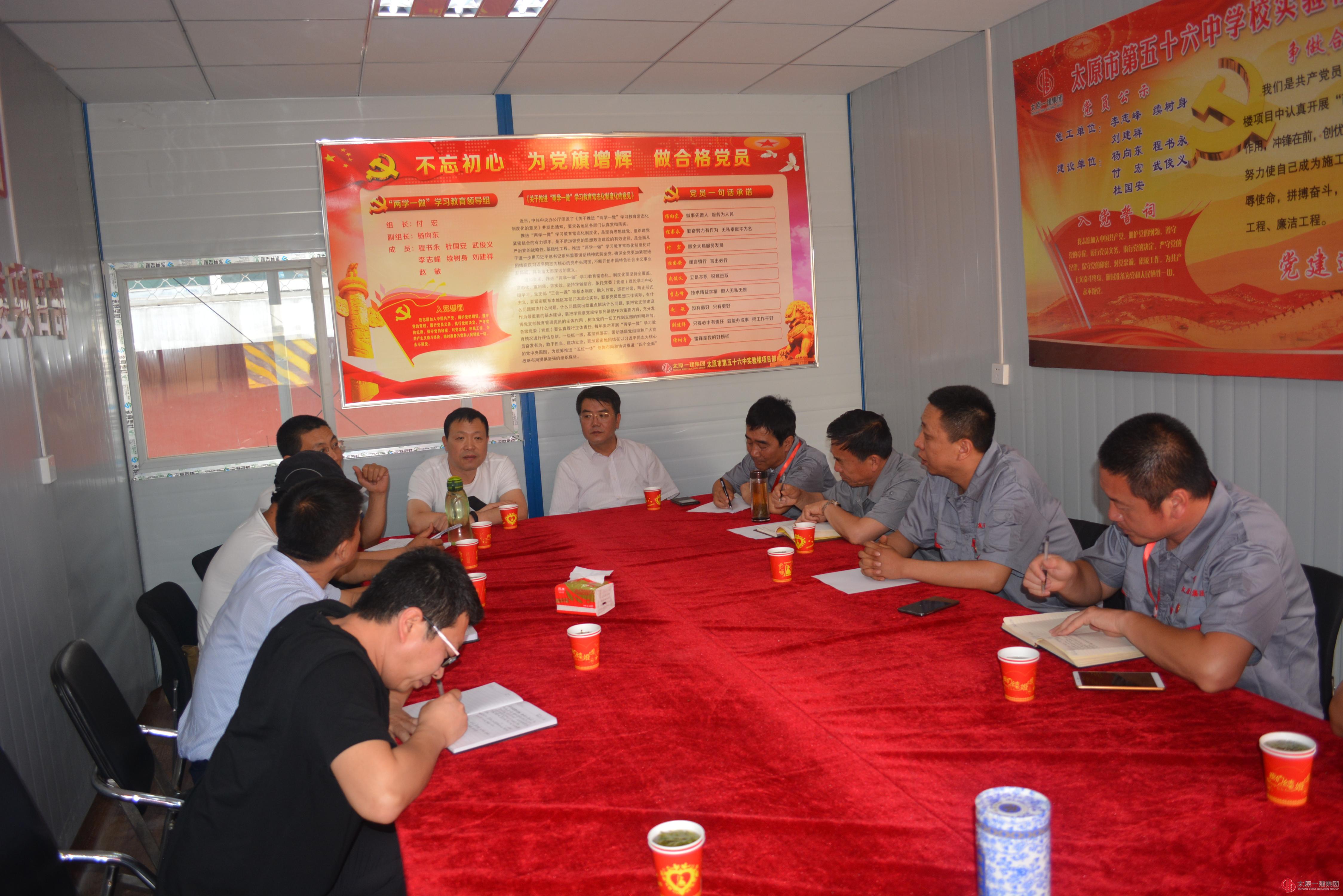 结合当前“两学一做”学习教育常态化制度化实施方案及市住建委党工委“党建进工地,引领促发展”的主题学习教育。6月14日上午由市住房保障中心、建设单位、监理单位、施工单位等四个参建单位的9名党员组成的56中学实验楼项目联合党小组,在56中实验楼项目部会议室召开“党建进工地,引领促发展暨两学一做”学习教育会议。市住房保障中心王占平副主任、常智鹏书记、杜国安科长、监理公司冯工、56中学程主任、集团公司党委委员李瑞琪、六分公司赵敏、刘立柱、李志峰、刘建祥等参加会议。