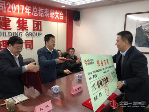 集团公司领导和项目管理公司总经理王斌共同为2017年度表现突出的五个先进集体、十一个先进个人颁发了奖杯、证书和奖品,王贵聪董事长为项目管理公司2017年度特别贡献奖获得者黄金鑫颁发证书和奖金拾万元。