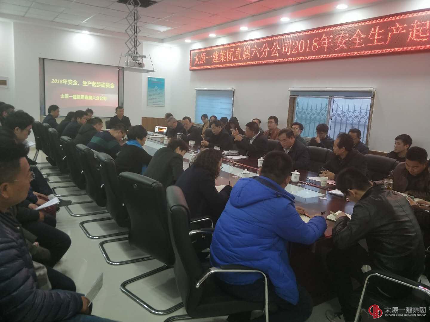 首先,分公司全体成员在副经理赵琳带领下,集体学习了董事长王贵聪、总经理李世雄在集团公司“2018年安全工作暨生产起步动员会”上的讲话精神;二是副经理吴朝辉对分公司2018年面临的新问题、新挑战、新希望,详细的对安全、生产、劳务、技术等各方面工作做出了安排部署。指出:2018年分公司在建的三个工程项目,都是太原市政府的重点工程项目,好比董事长王贵聪形象比喻的“三座大山”。要求全面做好“三座大山”的各项工作,直属六分公司必须思想重视,坚定信心,下定决心,牢固树立“我能行,我必行”信念,必须有铁一般的纪律和执行力,精心组织各项工作计划。三是分公司项目负责人杨发增、李永义、李睿、吴朝辉依次对在建项目作了2018年安全生产情况工作安排,并立下军令状,保证在安全的前提下完成计划产值目标,保质保量的完成今年各项任务。四是分公司经理原扎根作了起步动员讲话。原扎根强调:2018年各项工作已做了安排部署,直属六分公司必须做到安全生产“八个必须”、高质量发展“五个”方面的要求,坚持“先安全后生产,不安全不生产,保安全促生产”的目标;必须用登高一步、开拓创新、积极进取的精神和主动作为、勇于担当、真抓实干的作风迎接新一年的挑战。同时,要求新的一年分公司上下必须团结一致,互敬互爱,把团队的事、项目的事、公司的事当做自己的事去完成,必须保证有铁一般的纪律和强有力的执行力,必须加强与甲方对超量超盖、图纸修改、进度结算等方面的沟通,并对分公司人员工资调整进行承诺。