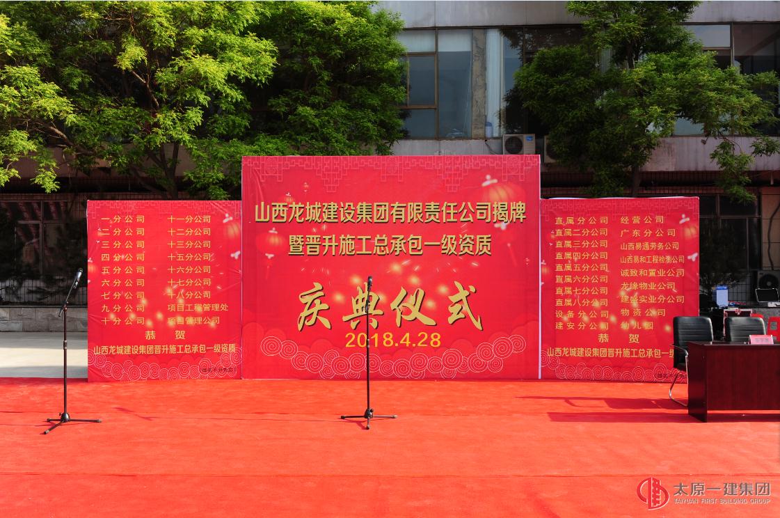 2018年4月28日,阳光明媚,彩旗飘飘,锣鼓喧天,龙城建设集团有限责任公司在总部大院里举行了庆祝晋升施工总承包一级资质暨揭牌仪式的庆典。上午8点18分,龙城建设集团董事长任海鹏与新成立的4个子公司负责人共同进行了揭牌仪式。10点58分在省市建筑业协会领导们、兄弟友好单位、所有一建集团基层单位及龙城所有员工的见证下,集团公司董事长、总经理与龙城建设集团董事长、总经理共同揭牌。此庆典议程由工会主席张凯主持。在庄严的国歌,司歌,升国旗议程里,整个庆典也增添了仪式感。由集团公司总经理助理赵峰宣读国家住建部核准龙城建设集团公司房建总承包一级资质证书。集团公司总经理李世雄致贺词,并向龙城建设集团总经理李新发颁授资质证书。此时,太钢锣鼓队响彻龙城大院,全体员工掌声四起。龙城建设集团董事长任海鹏、总经理李新发、青年职工代表李阳分别作了表态发言。最后,省市建筑业协会领导,集团公司董事长王贵聪作了重要讲话。所有与会人员合影留念,庆典圆满成功。
