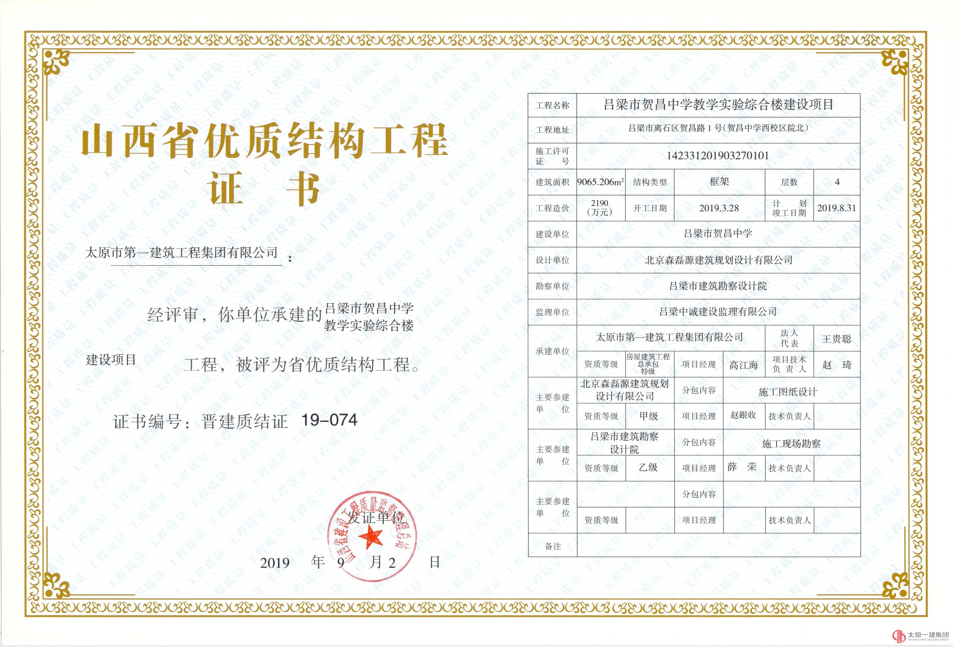截止目前,2019年集团公司创省级结构优质工程数量累计已达到七项,位列全省建筑施工企业第三名!太原一建集团将以创建优质工程为契机,珍惜荣誉,再接再厉,为打造品牌一建、创建百年企业不忘初心、牢记使命,为推动山西转型发展,建设美丽并州做出应有的贡献!